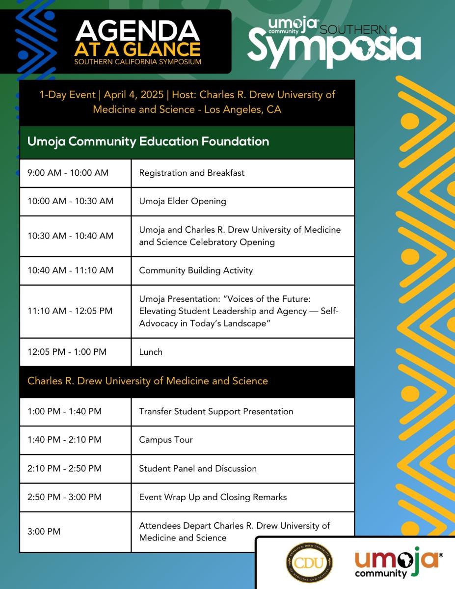 The Umoja Community Education Foundation annually hosts the Regional Symposium, a transformative event held in both the Northern and Southern regions of California during the spring semester in April. Specifically designed to serve our 73 affiliate programs, the symposium serves as a dynamic platform for collaborative learning and growth. Each regional event encompasses a rich array of activities, including workshop sessions, engagement with four-year universities, connection to the African Diaspora, cross-regional support, and alliance building. Moreover, the symposium aligns with the elements of the UCEF Memo of Understanding (MOU), offering targeted training and development sessions to identify Umoja Practitioners and acknowledge students' contributions to establishing thriving Umoja programs.