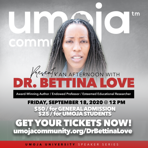 Umoja will host Dr. Bettina Love for the inaugural session of the Umoja University Speaker Series on Friday, September 18, 2020, at 12 p.m. You can learn more about the event by going to http://umojacommunity.org/DrBettinaLove. The tickets for this event are $50 for general admission and $25 for students.